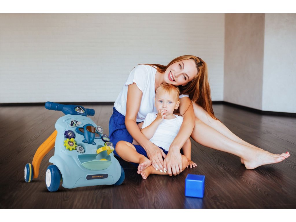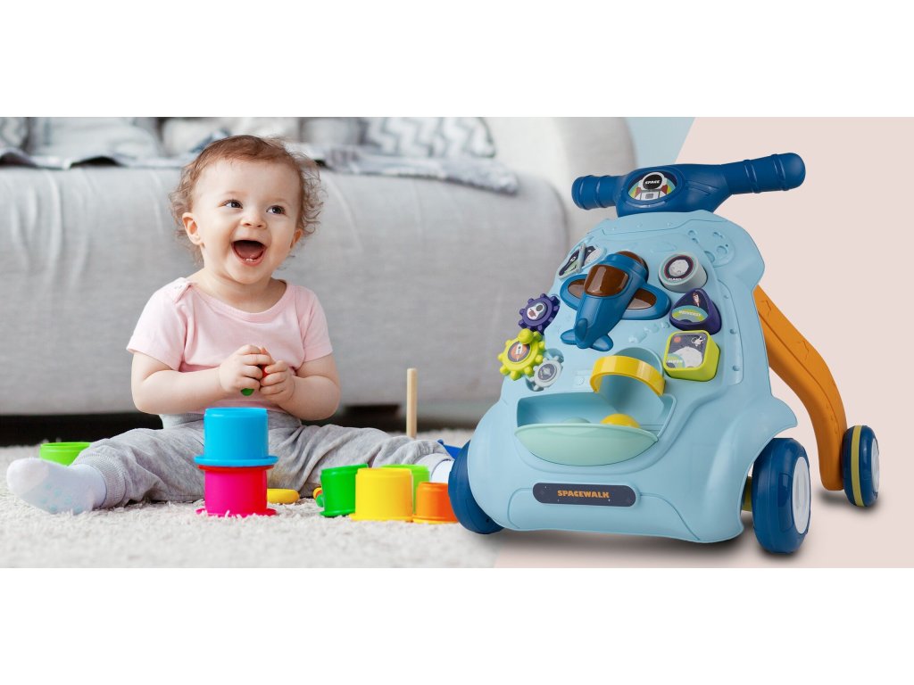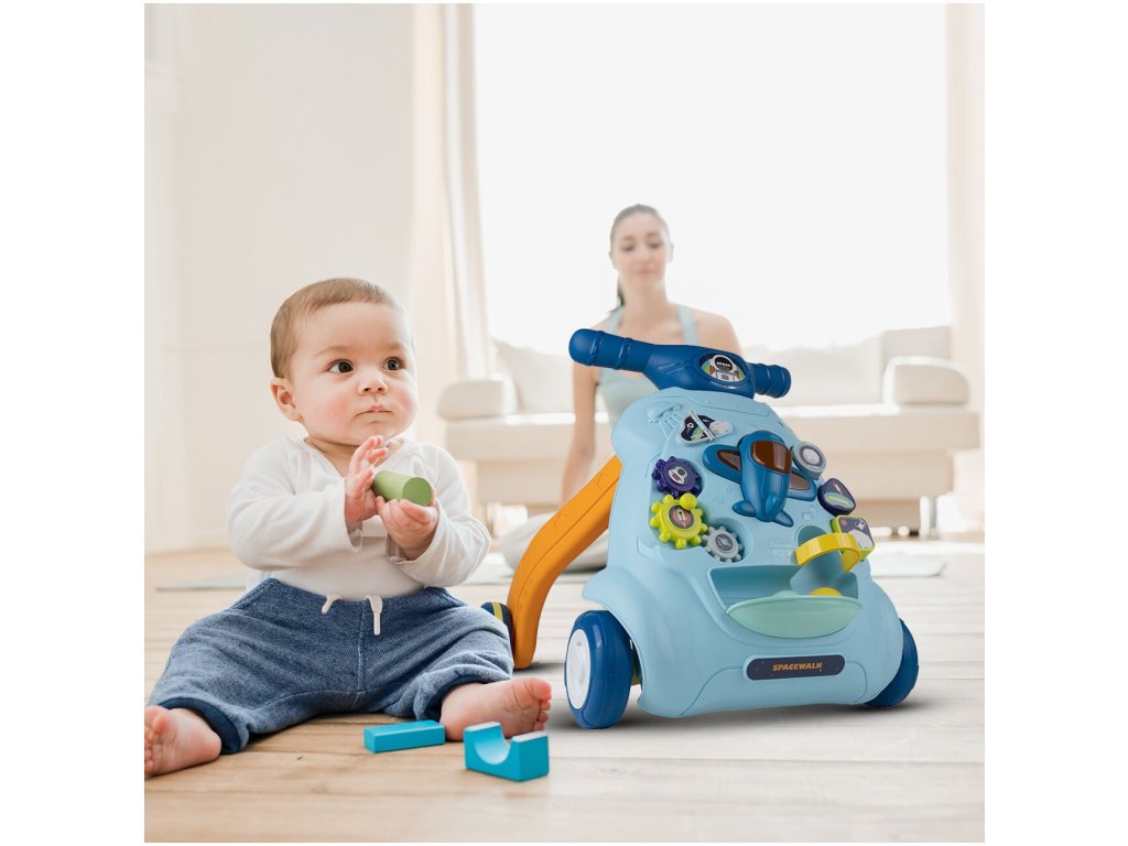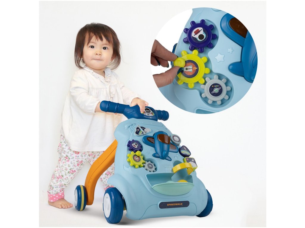 Dětské multifunkční chodítko Space Walker pro ty nejmenší děti, edukační centrum. Je vyrobeno tak, že dítěti pomáhá udržet rovnováhu a stabilitu při chůzi. Chodítko je vybaveno otočnou knížečkou, ozubenými kolečky, letadlem se zvukovými a světelnými efekty, vyjímatelnými kostkami a dvěma míčky. V horní části chodítka je umístěn držák pomocí kterého dítě snadno udrží rovnováhu a nespadne na zem. Určeno pro děti od 6 do 18 měsíců věku.