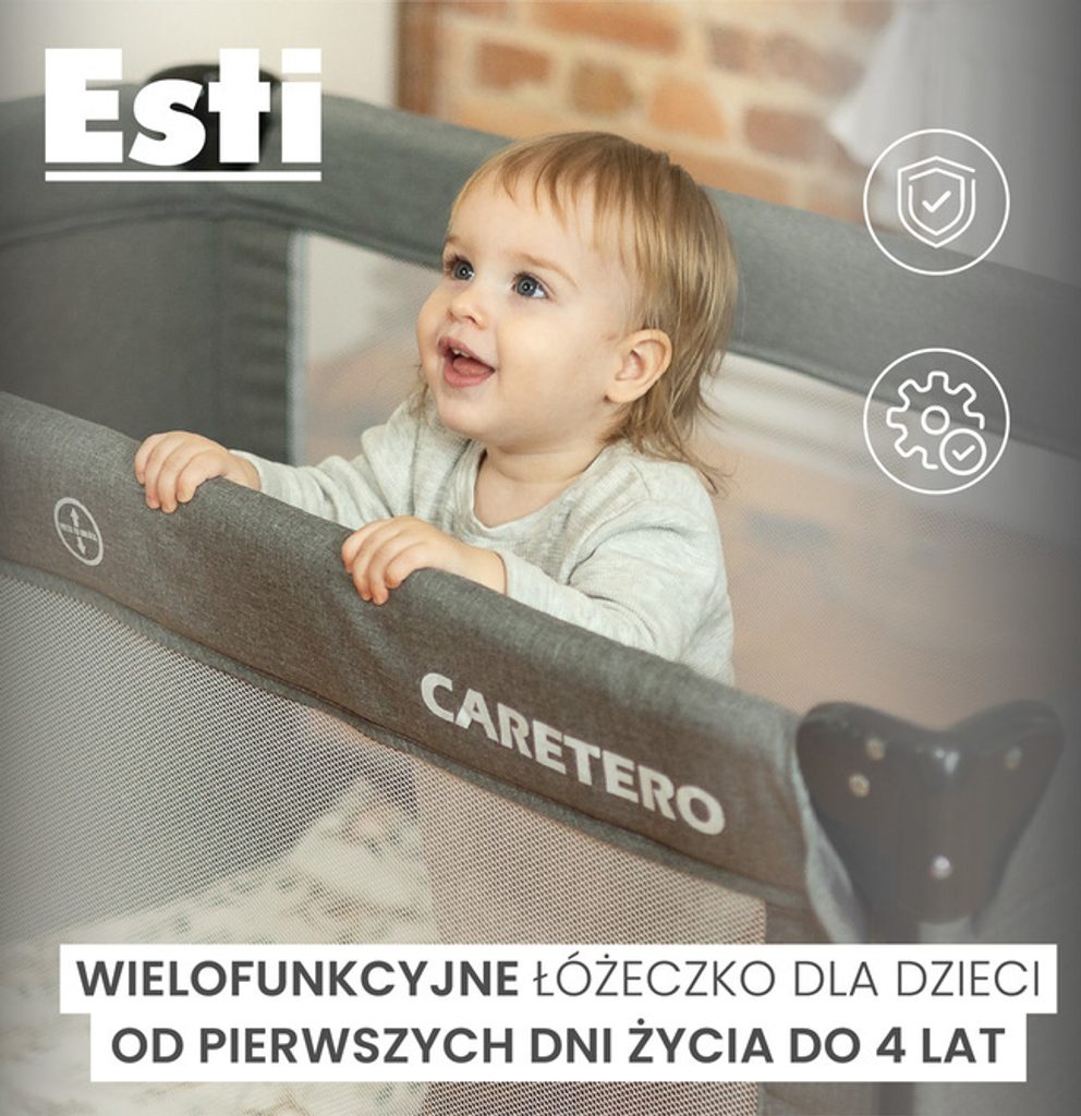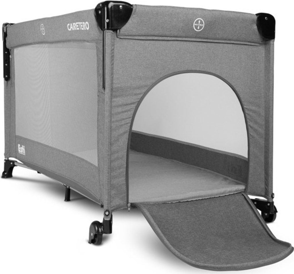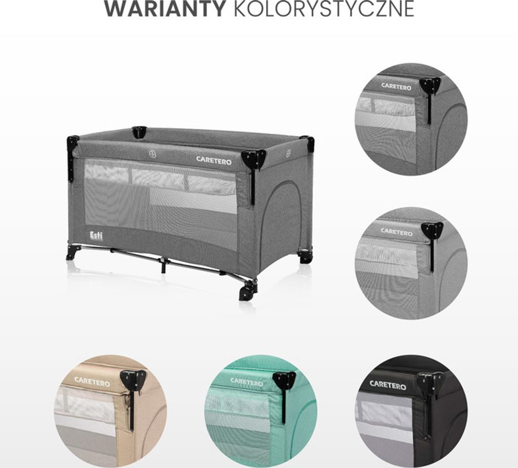 Cestovní postýlka Esti je cestovní postýlka určená k usnadnění péče o miminka. Její největší předností je sklopná bočnice, která promění postýlku na přistýlku a zajistí pohodlnější přístup k dítěti. Praktický skládací mechanismus znamená, že složení nebo rozložení zabere jen okamžik. Postýlka má také kolečka s blokádou pro snadné přenášení. Boční dvířka uzavíraná na zip umožní starším dětem bezpečný vstup do postýlky, kterou lze využít jako ohrádku. Postýlka splňuje normu EN 716: 2017-07