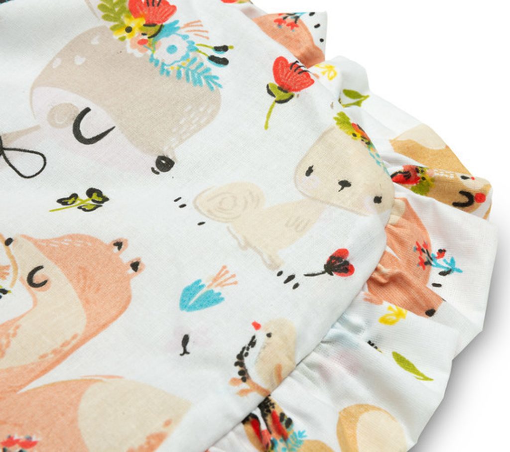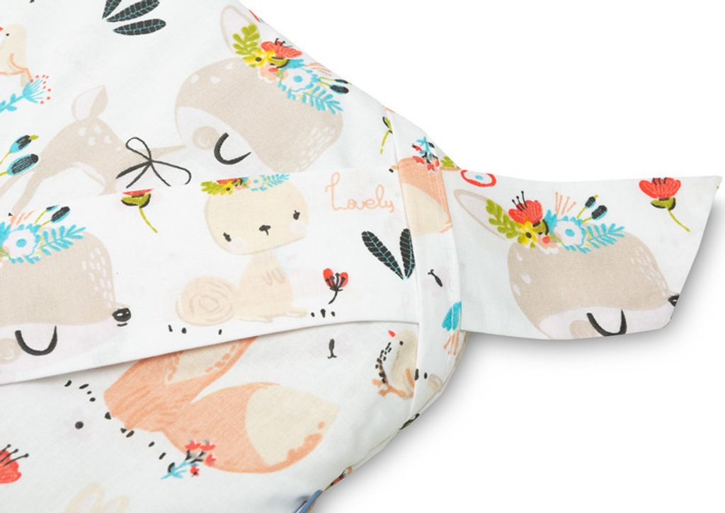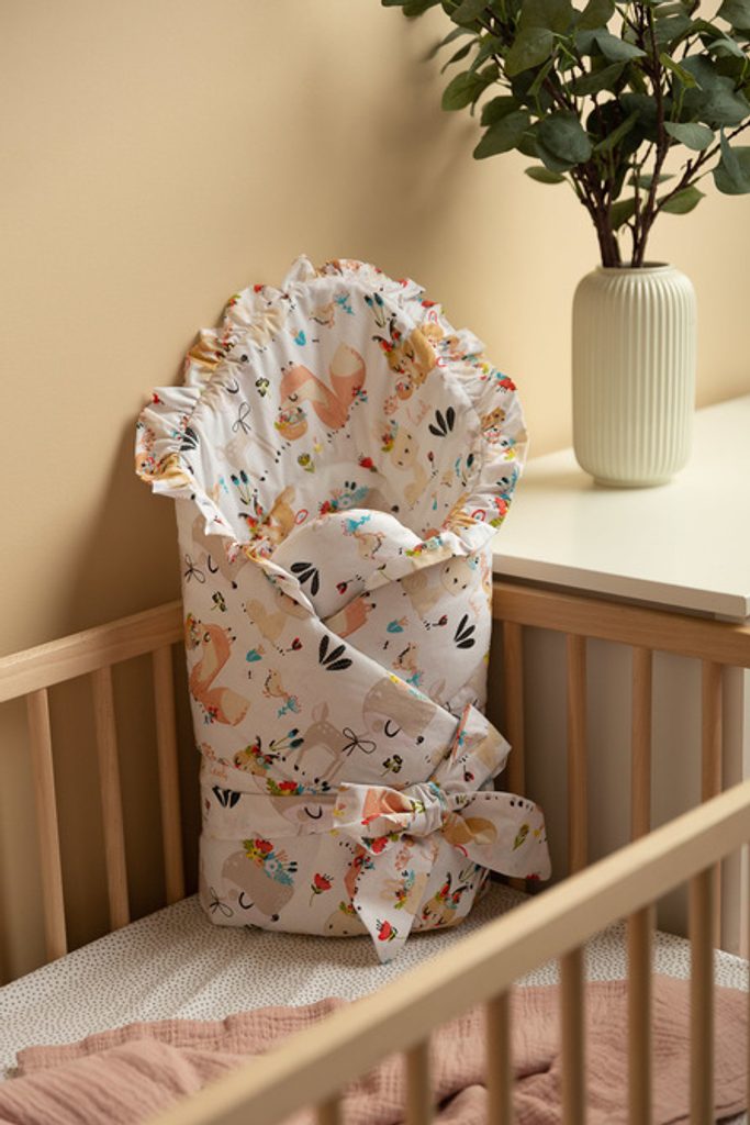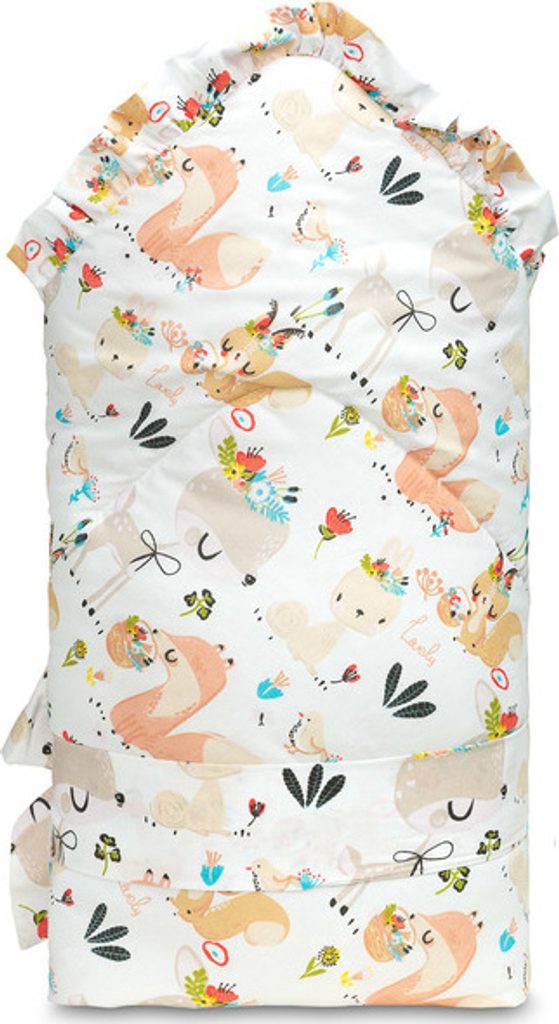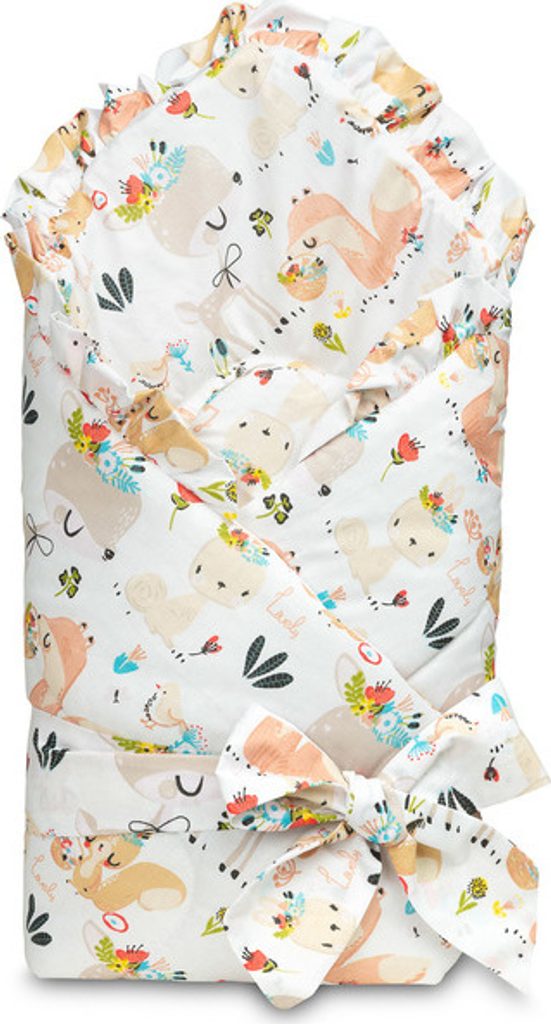 Oboustranná dětská zavinovačka s volánkem byla vytvořena s ohledem na novorozence a kojence. Uzlové zapínání se širokou bavlněnou stuhou umožňuje pohodlné držení dítěte při krmení a uspávání. Po rozložení lze zavinovačku použít jako peřinku do postýlky nebo kočárku. Lze ji použít také jako podložku na hraní. Je vyrobena ze 100% bavlny. Výplň tvoří silikonové nadýchané rouno. Závěrečnou tečkou je vkusný volánek.