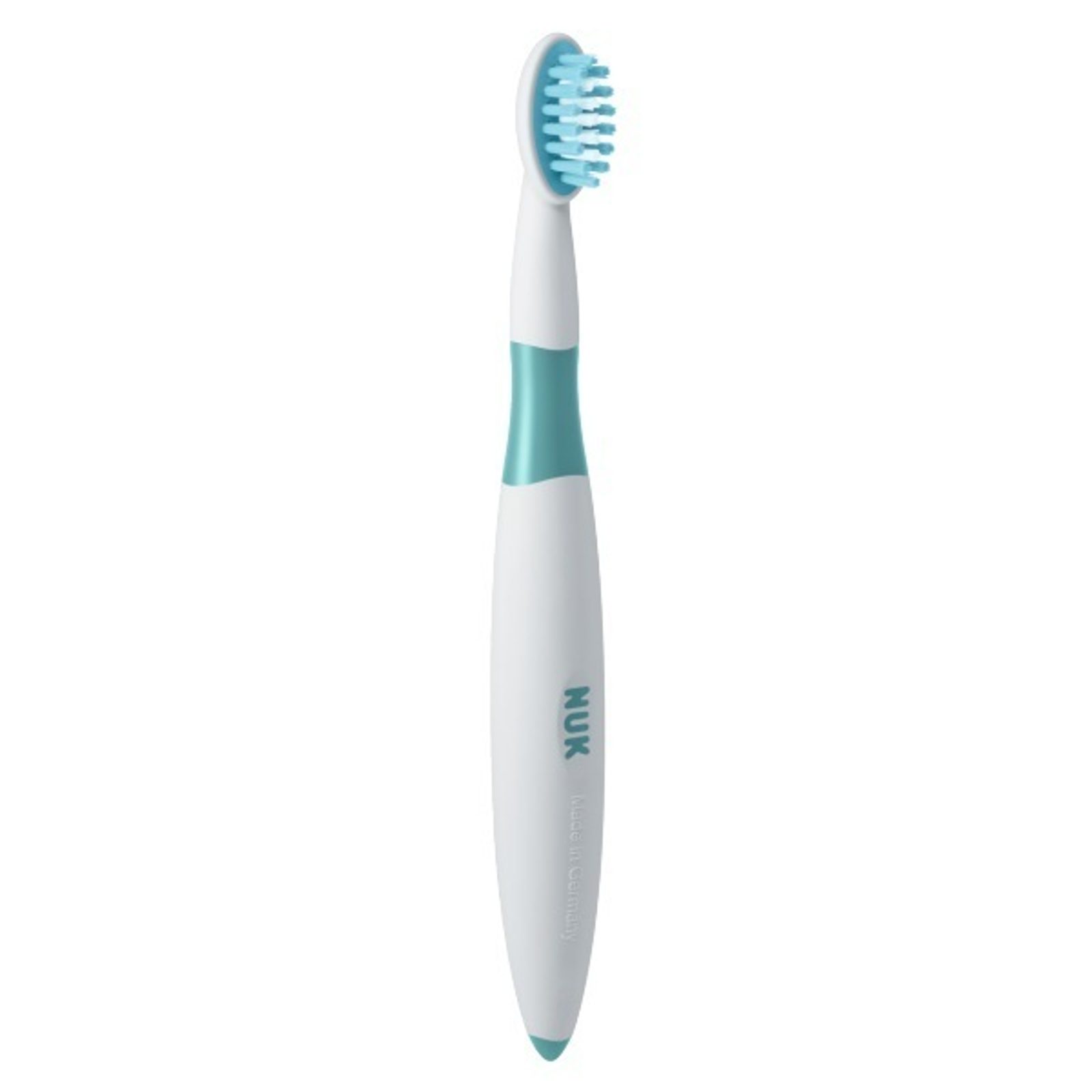 Aby mělo dítě zdravé zuby bez kazů, je velmi důležité, aby rodiče co nejdříve zahájili správnou péči o ústní dutinu. Dětský zubní kartáček NUK je ideální k tomu, aby se dítě naučilo čistit si zuby samo. Chrání dutinu ústní dítěte díky speciálně zaoblené hlavičce a měkkým zaobleným vláknům. Protiskluzová rukojeť, kterou může rodič držet s dítětem a vést rukojeť. Dodává se s bezpečnostním kroužkem, který zabraňuje zasunutí zubního kartáčku příliš hluboko do úst (lze použít i jako stojánek).