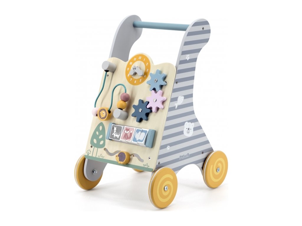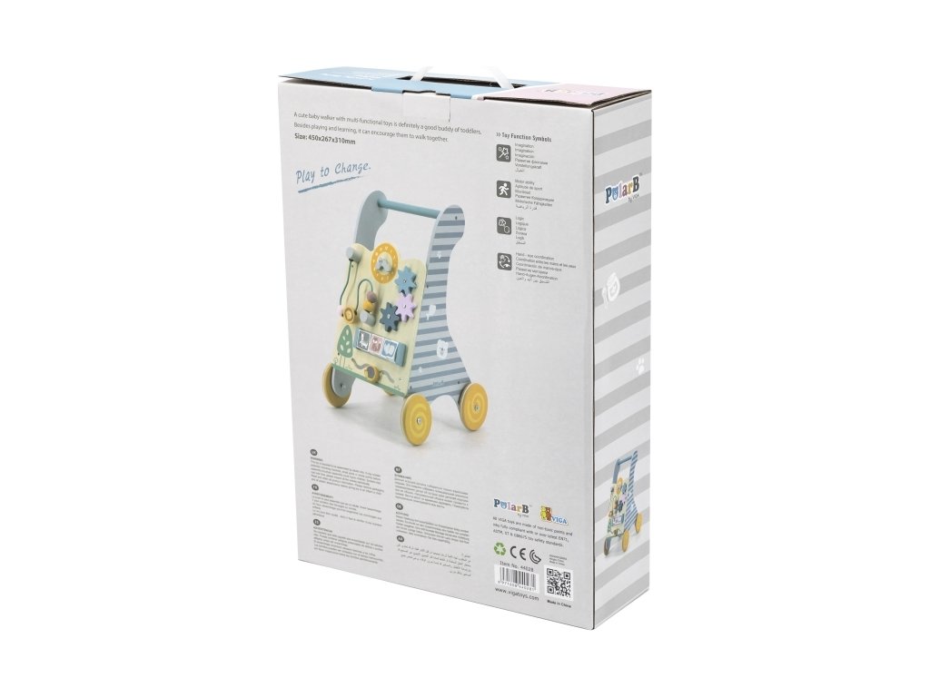 Vzdělávací odstrkovadlo pro děti navržené uznávaným výrobcem hraček pro děti od 18 měsíců Viga Toys. Funkční hračka pro děti, slouží také jako chodítko a výukový panel, díky kterému se dítě naučí sladit tvary a barvy. Otočné prvky v podobě převodů a drah se zvířátky na panelu a jeho bocích miminko zaujmou a zatraktivní zábavu. Bezpečnost a stabilitu zajišťují široce rozmístěná kolečka potažená protiskluzovou gumou (nepoškrábe podlahy) a dřevěná rukojeť.