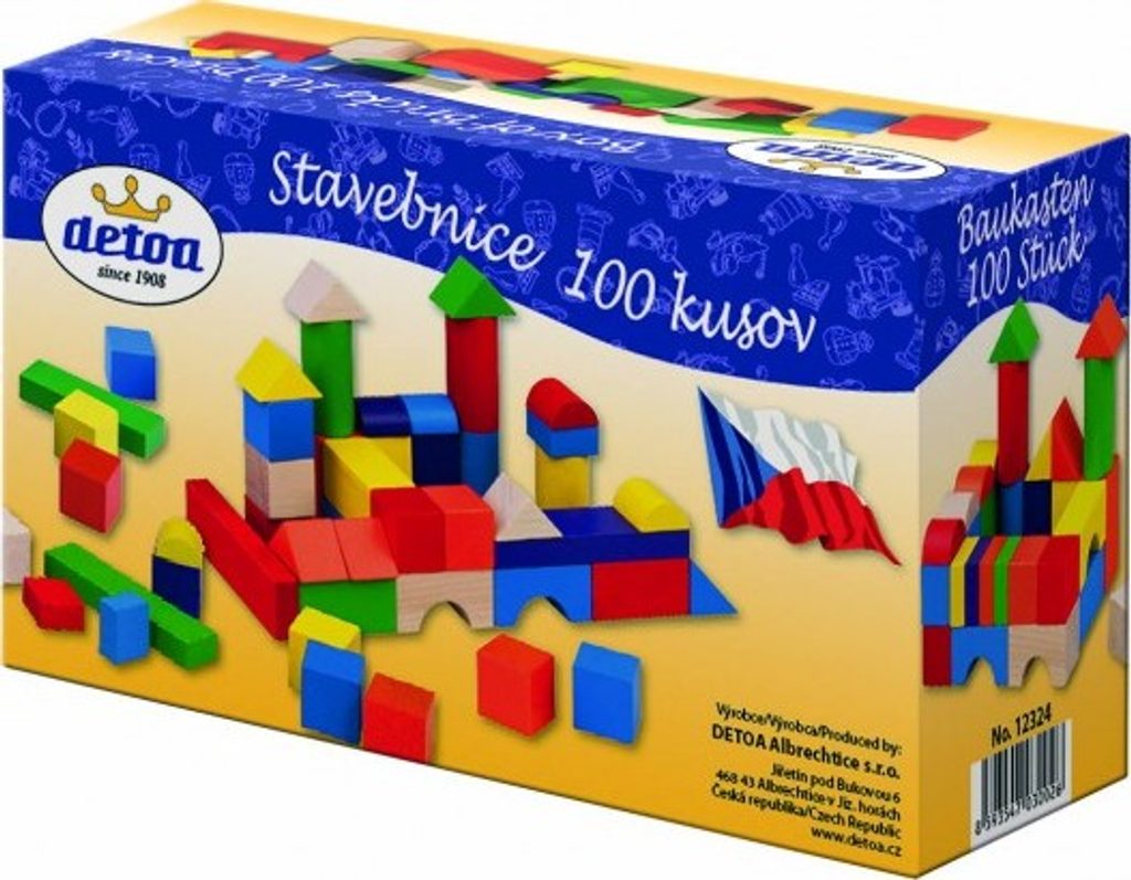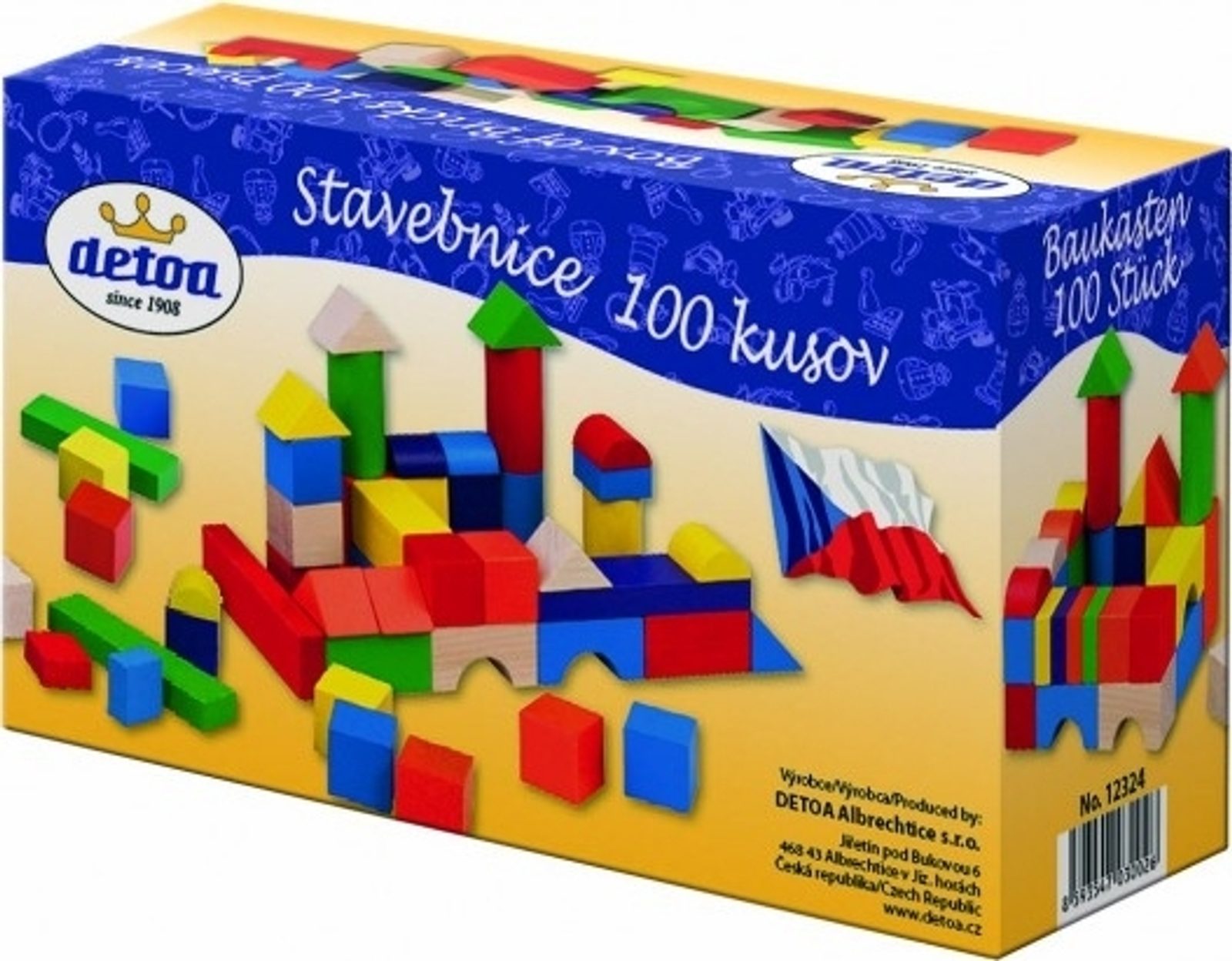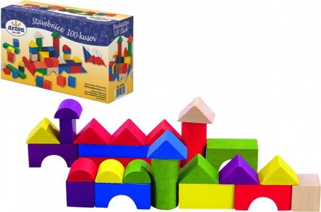 Stavebnice obsahuje 100 barevných dřevěných dílků v různých tvarech a velikostech. Základní velikost krychle je 20 mm.