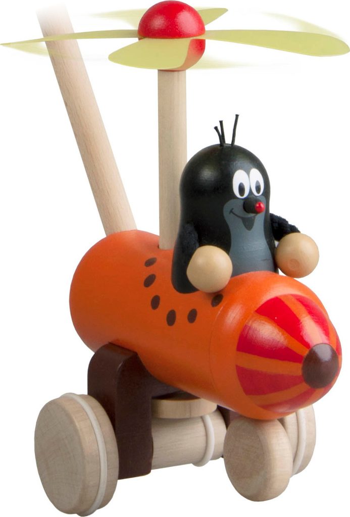 Strkadlo Krtek a vrtulník je dřevěná hračka na tyči. Při pohybu se vrtule otáčí. Výrobek splňuje požadavky EU na bezpečnost hračky. © Zdeněk Miler