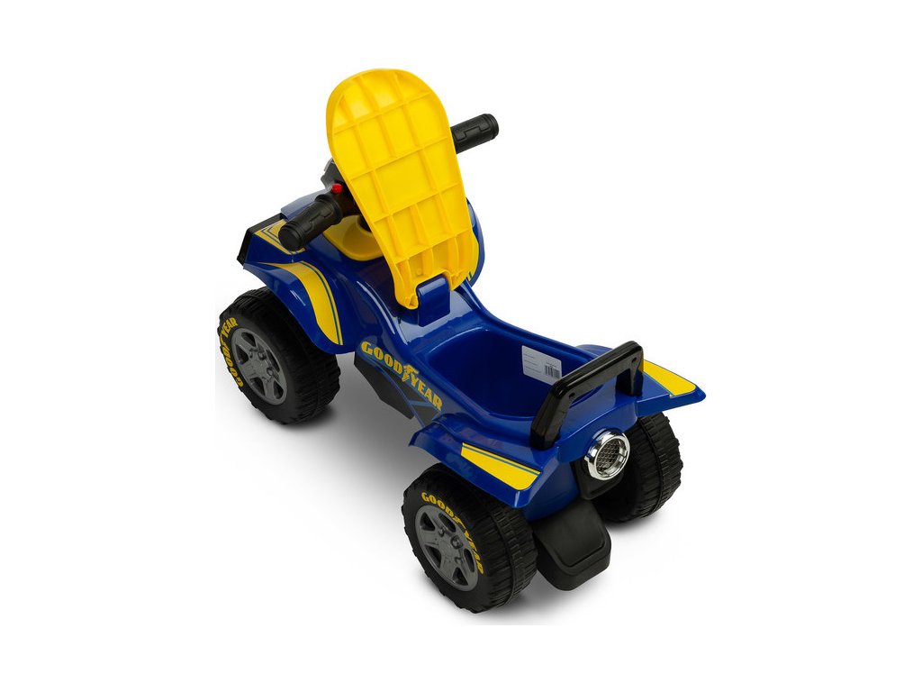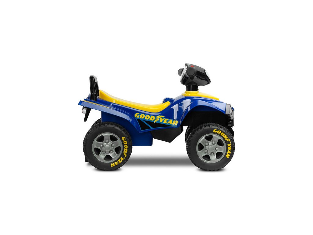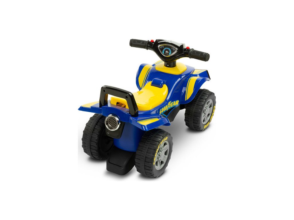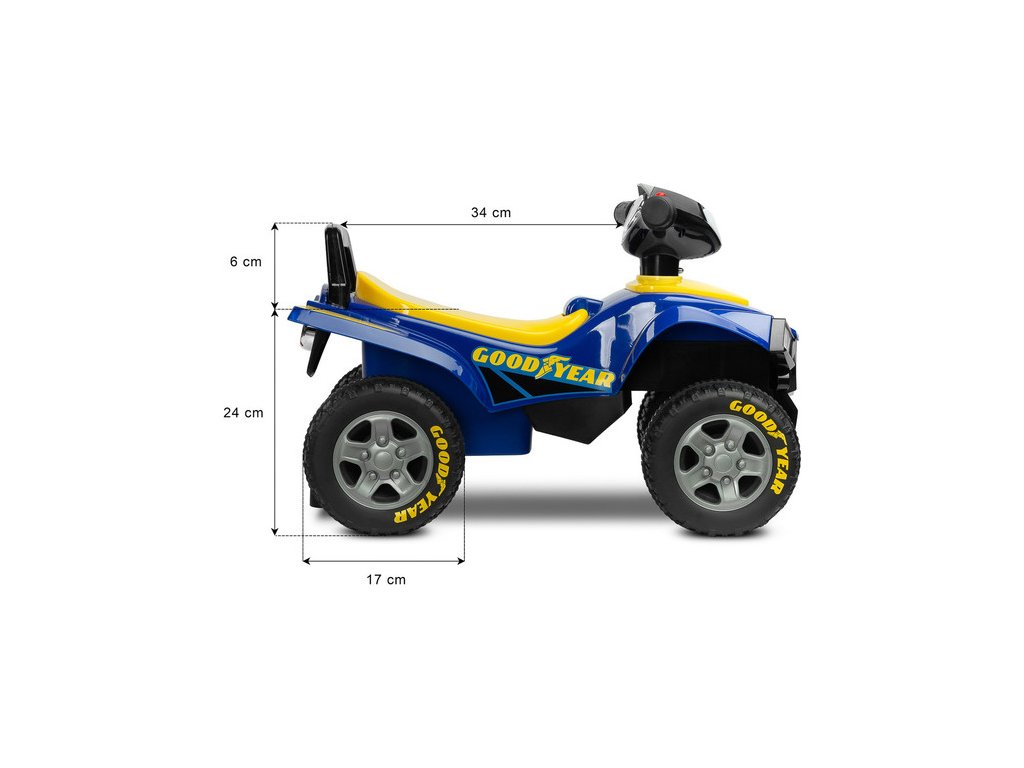 Čtyřkolka Goodyear od TOYZ je hračka určená pro děti ve věku od 1 do 3 let. Hračka ve tvaru čtyřkolového vozidla je vybavena volantem s tlačítky zodpovědnými za zvuk klaksonu a motoru. Výrobek je vyroben z vysoce kvalitních materiálů, což zaručuje jeho odolnost a pevnost. Hračka se snadno čistí a skladuje. Pojezd má ochranu proti převrácení dozadu