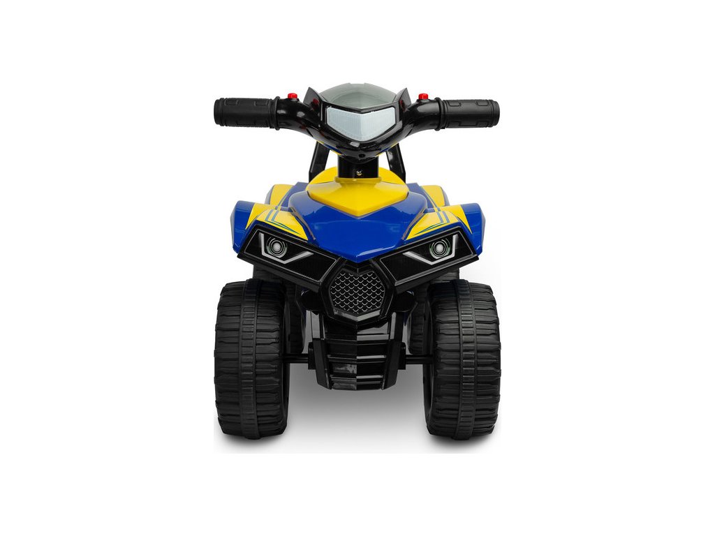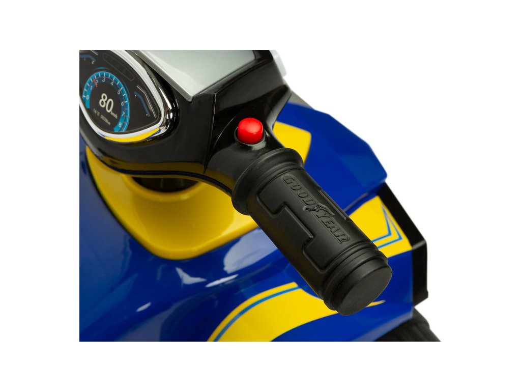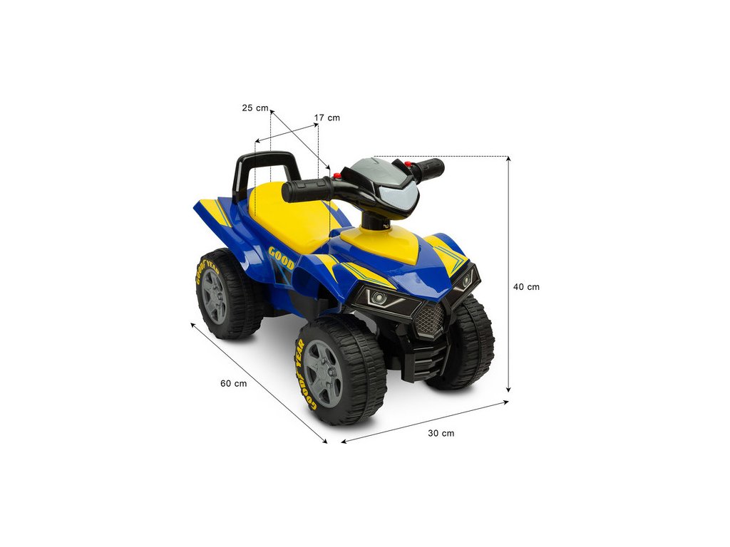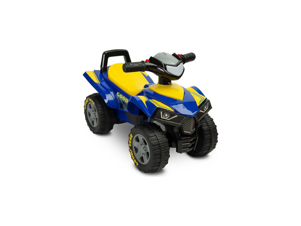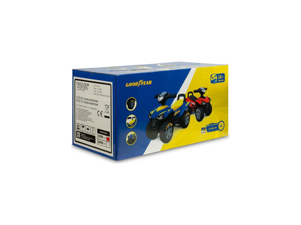 Čtyřkolka Goodyear od TOYZ je hračka určená pro děti ve věku od 1 do 3 let. Hračka ve tvaru čtyřkolového vozidla je vybavena volantem s tlačítky zodpovědnými za zvuk klaksonu a motoru. Výrobek je vyroben z vysoce kvalitních materiálů, což zaručuje jeho odolnost a pevnost. Hračka se snadno čistí a skladuje. Pojezd má ochranu proti převrácení dozadu