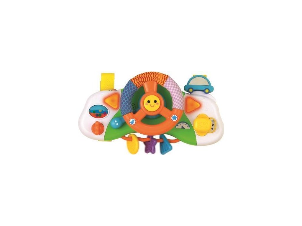 Doporučeno pro malé milovníky aut. Batole se může skvěle bavit hrou na řidiče, protože zde najde všechny potřebné prvky. Aktivační hračka zabaví vaše miminko na dlouhou dobu. Má mnoho funkčních, pohyblivých prvků, které vám zpestří čas při procházkách, cestování nebo doma. Má upevňovací popruhy na postýlku, kočárek... takže se snadno připevní v případě potřeby. Hračka napodobuje skutečné auto. K dispozici je pohyblivý volant s funkčním klaksonem a na něm 2 další tlačítka se zvuky a melodiemi. Chcete-li hračku zapnout, otočte klíčkem ve spínací skříňce. Posunem řadicí páky si dítě procvičuje obratnost ruky. Přepínač směrových světel je výborným cvičením v rozpoznání levé a pravé strany (když pohneme páčkou nahoru - bliká levý blinkr, a když se pohybujeme dolů - pravý blinkr). V bezpečnostním zrcátku vidíte, co se děje za vámi. Kromě toho může dítě procvičovat prsty otáčením barevného válečku nebo pohybem plastového disku, hvězdy nebo trojúhelníku. Povrch těchto prvků má různé textury, což navíc stimuluje hmat. Část volantu je potažena materiálem, který je důležitý pro smyslový vývoj dítěte. Volant je vyroben z bezpečného plastu, který se snadno udržuje v čistotě. Napájení: 2x 1,5V AA baterie (testovací baterie jsou součástí balení).Doplňkové parametry