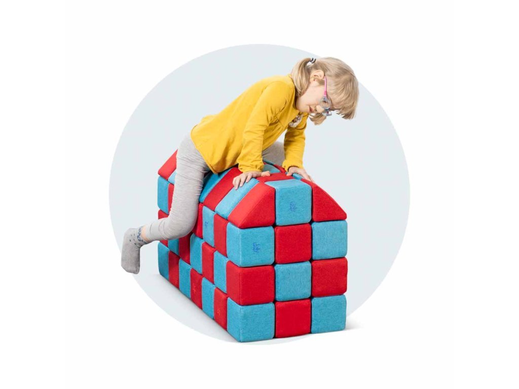 Díky nim se kostky snadno spojují a děti mohou vytvářet neomezené množství tvarů – od jednoduchých věží až po domečky, hrady, prolézačky či sedací nábytek.
