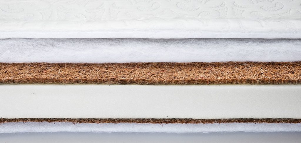 • Matrace je vyplněna dvěma kokosovými rohožemi (2 × 1 cm) obalenými nadýchaným rounem, oddělenými polyuretanovou pěnou (5 cm)