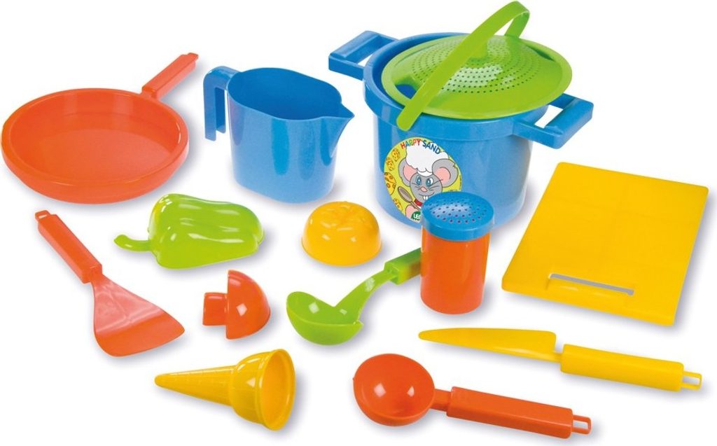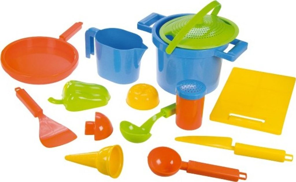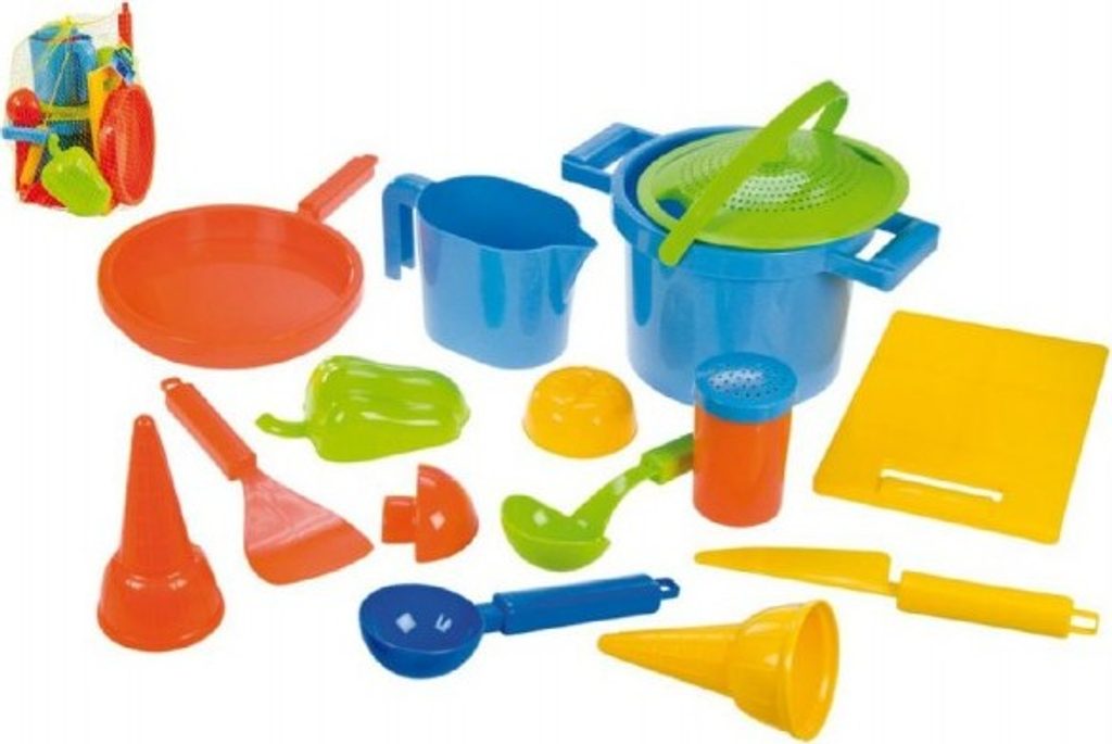 Set na písek na vaření obsahuje vše, co malý kuchař potřebuje. Sada se skládá ze sítko/poklička, hrnec, 3x zelenina, solnička, naběračka, obracečka, nůž, prkénko, pánev, odměrka, kornoutek, zmrzlinová naběračka.