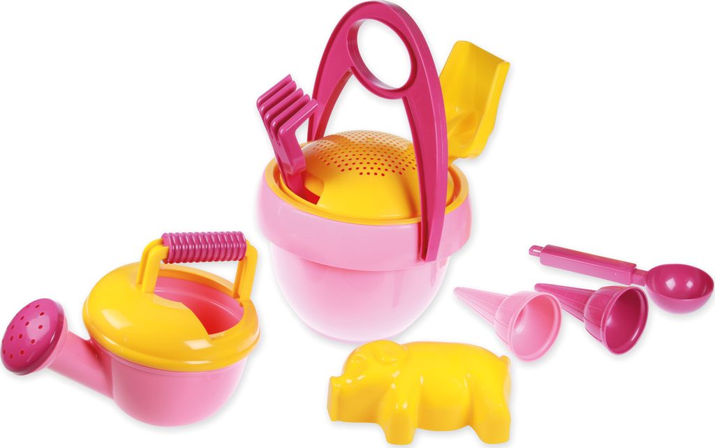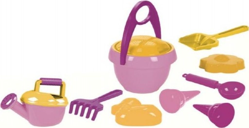 Sada ba písek pro holky, která obsahuje kyblík, sítko, konev a další doplňky.