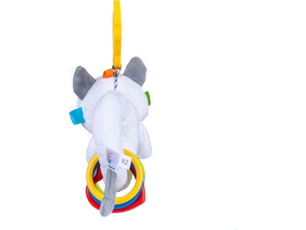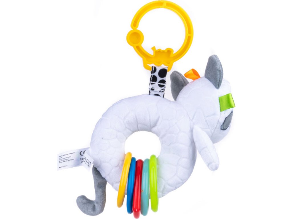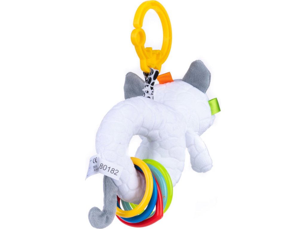 Jej hlavu zdobia štítky s rôznymi textúrami a bruško farebné kruhy, ktoré pri zatrasení nádherne hrkajú. Praktická spona umožňuje hračku kdekoľvek pripnúť.