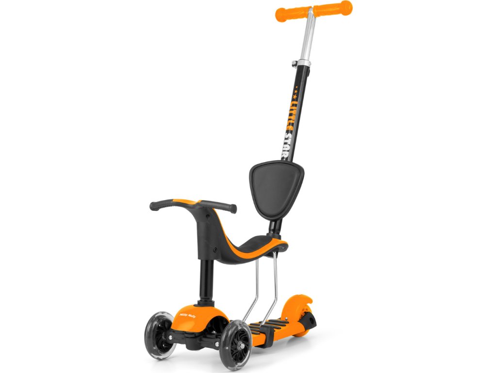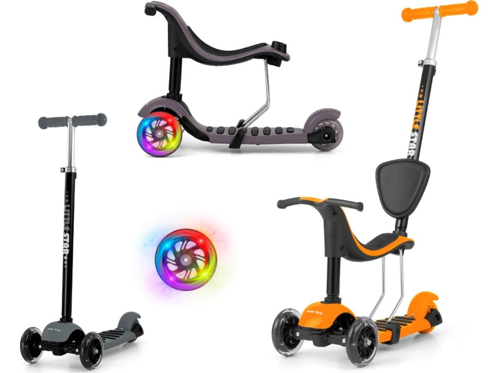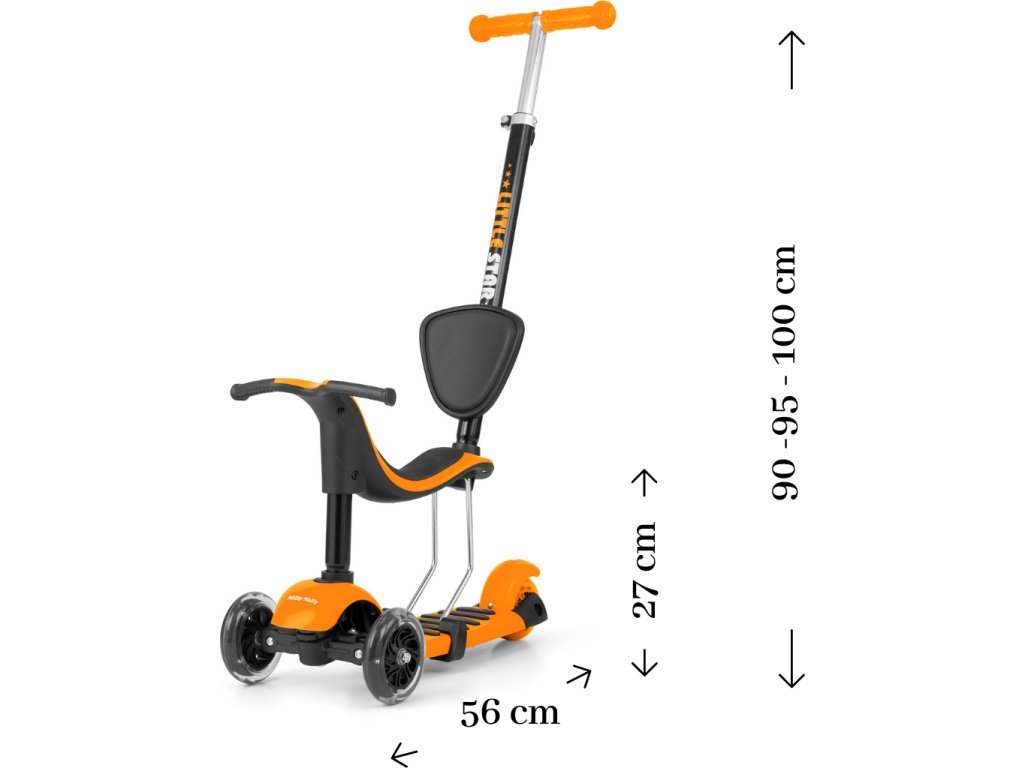 Super štýlová kolobežka Milly Mally Little Star pre deti. Nie je to len kolobežka, je to aj kolobežka pre deti od druhých narodenín, ktorá má sedadlo aj vodiacu tyč pre rodičov. Nosnosť do 20 kg. Sedadlo a vodiaca tyč sa dajú jednoducho odňať a z kolobežky sa zrazu stane kolobežka s nosnosťou až 50 kg. Je ideálna pre aktívne deti, ktoré sú neustále v pohybe. Little Star je vyrobená z kvalitných materiálov, ideálna na prechádzky a skvelú zábavu. Kovová konštrukcia zaručuje odolnosť výrobku. Kolobežka má tiež brzdu a blatník na zadnom kolese. Riadenie a zatáčanie funguje na princípe rovnováhy tela. Veľkou výhodou kolobežky sú 3 kolieska, ktoré zabezpečujú stabilitu a bezpečnosť. Deti potešia aj predné kolieska, ktoré počas jazdy svietia. Little Star je 3v1, pohodlie a jednoduchosť v modernej podobe.