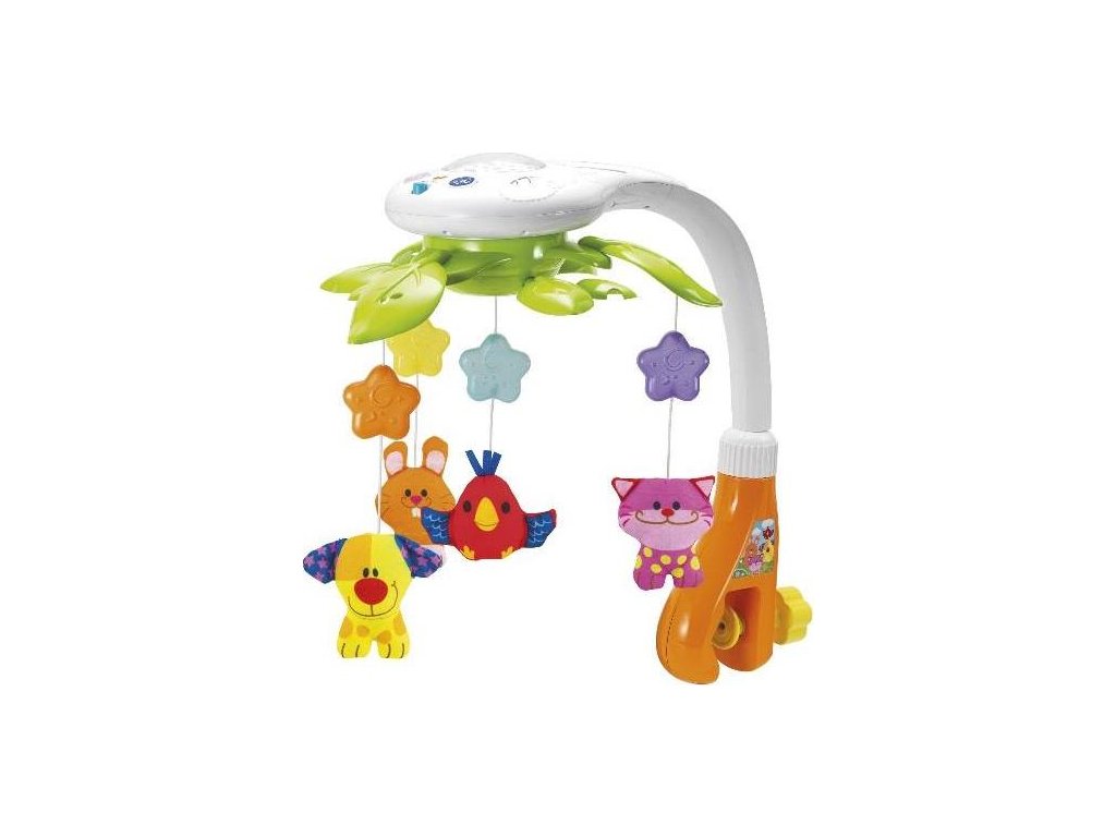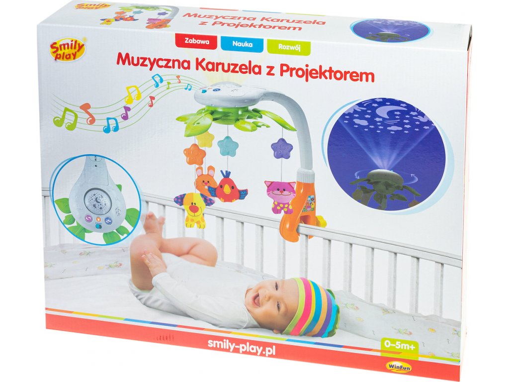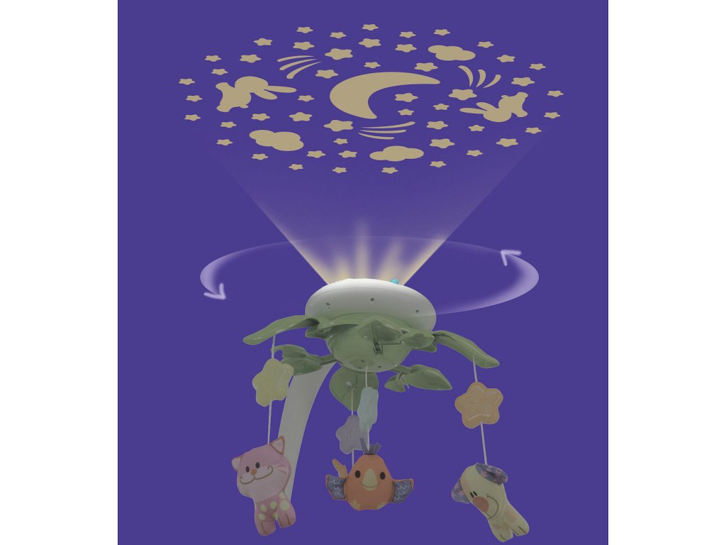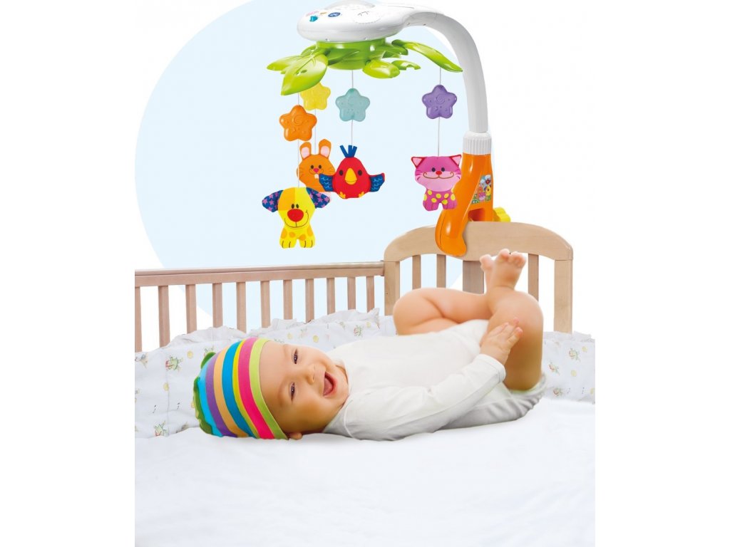 Kolotoč nad postieľkou so svetelným projektorom.Farby, svetlá a zvuky sú najzaujímavejšie javy, ktoré si každé dieťa všíma na začiatku svojho vývoja. Kolotoč pripevnený k postieľke vám poskytne pocit bezpečia, zamestnania, zaujímavosti a upokojenia.