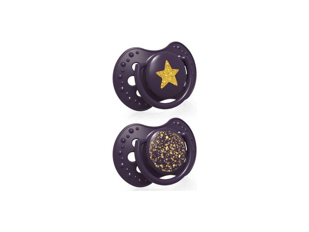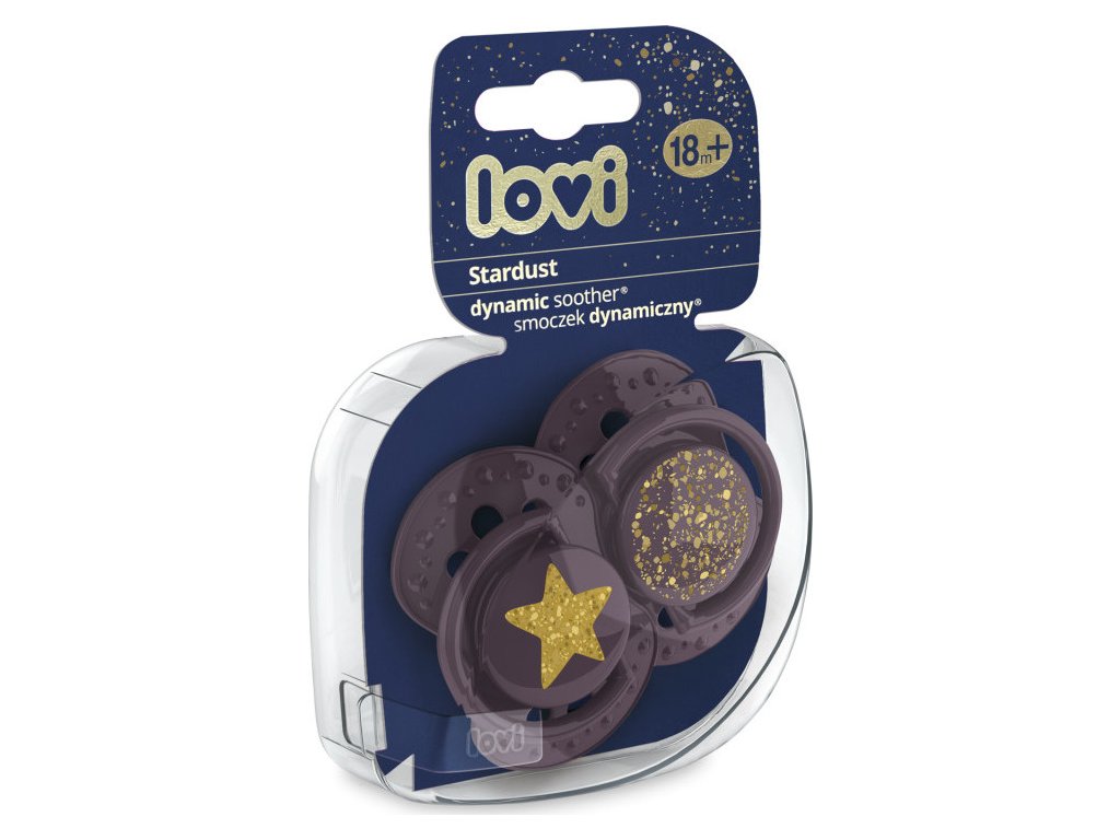 Hviezdny prach je tu! Jedinečná, dizajnovo neprehliadnuteľná prémiová kolekcia od spoločnosti LOVI. Jedinečný dizajn kolekcie Stardust - zdobený zlatými trblietkami, ktoré pripomínajú hviezdnu oblohu. Kolekcia sa pýši dynamickým cumlíkom LOVI vo veľkosti 18m+, ktorý bol vytvorený v spolupráci s neurológmi, aby zabezpečil prirodzený a zdravý vývoj podnebia, zubov a ďasien starších detí. Elastický pás cumlíka sa dynamicky prispôsobuje saniu dieťaťa, pričom nenarušuje sací reflex. Neobsahuje BPA. V balení po 2 ks.