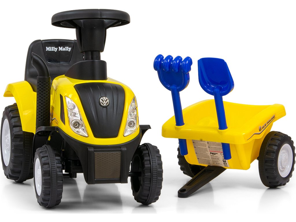 Natáčacie predné kolesá, Volant s logom New Holland vybavený piskotom, Dve tlačidlá na ploche so zvukmi klaksónu a štartovanie motora a možnosťou zapnutia/vypnutia svetiel, Príves s hrabľami a lopatou, Pohodlné sedadlo s operadlom, Kovové osi kolies, Ochrana vozidla proti prevráteniu dozadu, Vekové rozmedzie 12-36 mesiacov, Priemer kolies: predné - 14 cm, zadné - 20 cm, CE certifikát bezpečnosti, Napájanie: 2 AA batérie (nie sú súčasťou balenia v sade),