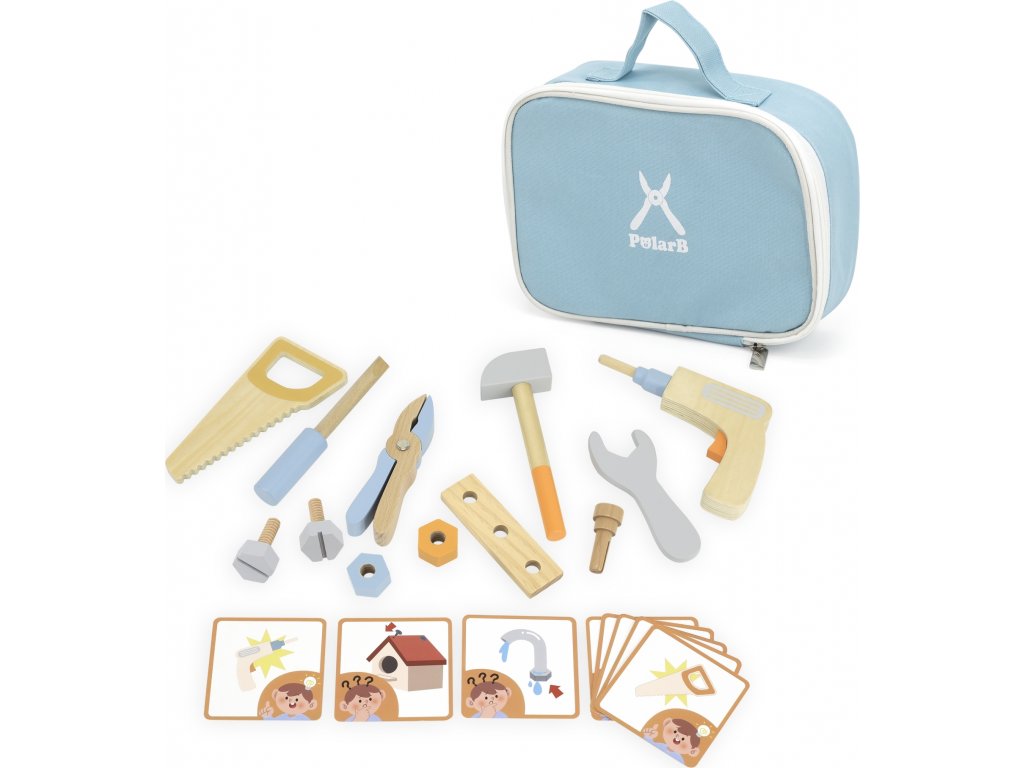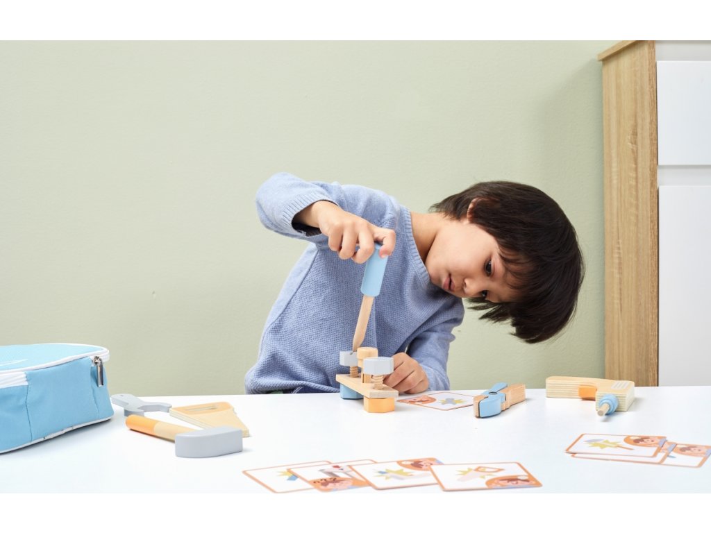 Sada obsahuje: - Píla - Skrutkovač - Kľúč - Vŕtačka - 2 matice - Kladivo - Kliešte - Drevená doska s otvormi - Skrutka - Kartičky s návrhmi, ako používať nástroje a riešiť problém - Estetický úložný kufrík Hračka je balená v puzdro na zips. Vďaka tomuto estetickému baleniu je hračka perfektná ako darček!