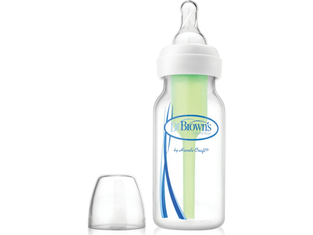 Najnovšia sklenená fľaša s úzkym hrdlom Dr. Brown's Options+ s cumlíkom úrovne 1. Vyrobená z farmaceutického borosilikátového skla, odolného voči rýchlym zmenám teploty. Fľaša má inovatívny antikolikový systém, ktorý znižuje výskyt koliky, grgania a plynatosti. Pomáha pri trávení a zabezpečuje pokojný spánok dieťaťa. Fľaša sa môže používať so systémom alebo bez neho. Ľahko sa čistí, možno ju umývať v umývačke riadu. Objem 120 ml. Pre deti od prvého dňa života. Neobsahuje BPA.