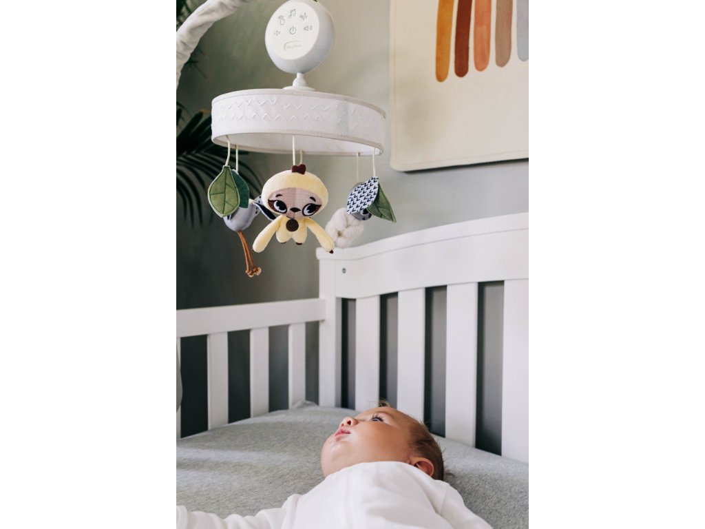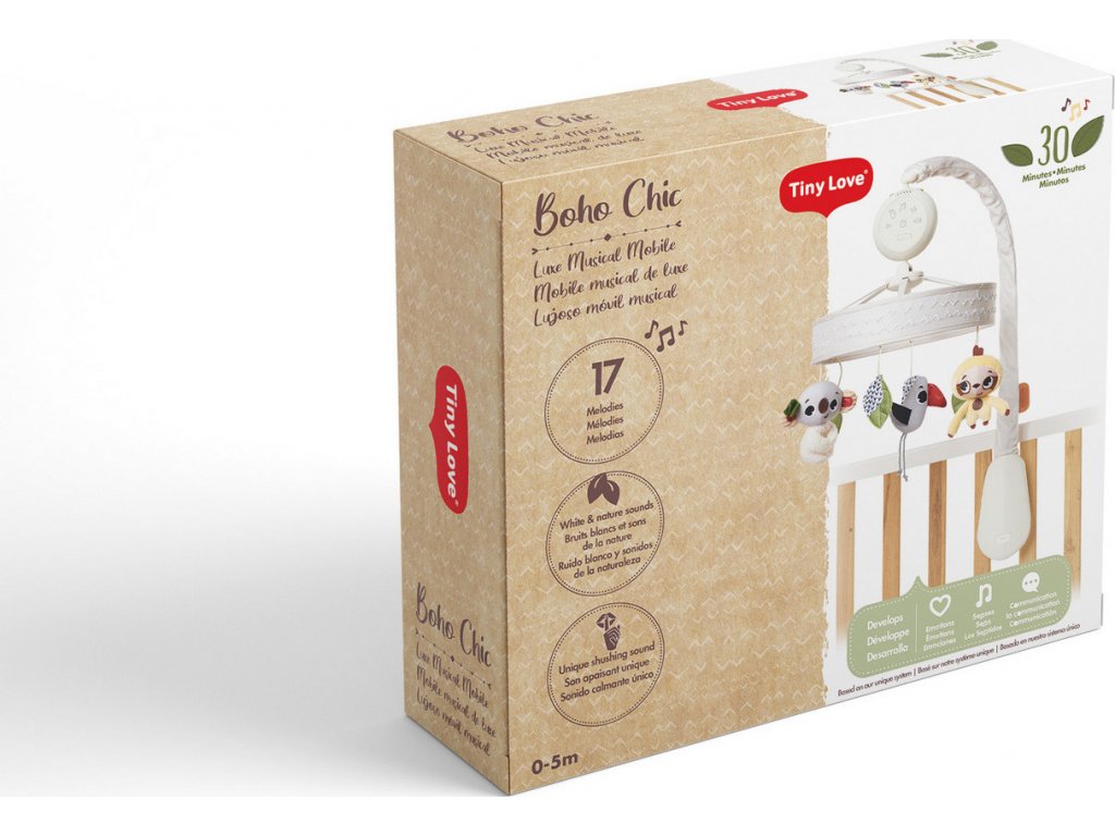 Módny dizajn a jedinečná paleta farieb kolekcie Boho Chic doplnia interiér vášho domova a vytvoria príjemný priestor, pričom podporia vrodenú schopnosť vášho dieťatka objavovať a rozvíjať sa. Jediný detský kolotoč na trhu, ktorý ponúka takú širokú škálu funkcií. Obsahuje roztomilé plyšové hračky a vintage povrchovú úpravu. Kolotoč určite upúta pozornosť vášho dieťaťa a premení jeho sen na skutočný, magický zážitok! Prvky. Mäkký poťah rámu pre mimoriadne útulnú atmosféru. Krásna vintage výšivka. Ovládanie hlasitosti. Jedinečný zvuk na utíšenie dieťaťa (funguje ako kúzlo!). Automatický časovač s tromi variantmi: 10/20/30 minút. Až 30 minút nepretržitej hudby (až 17 rôznych melódií). 5 zvukov - šumenie, tlkot srdca, vlny, padajúci dážď a spev vtákov. Kolotoč má navyše podsvietené tlačidlá LED pre lepšiu viditeľnosť v noci (automaticky sa vypnú po 5 sekundách) a tlačidlo na zapnutie/vypnutie funkcie otáčania kolotoča. Vývojové tipy: 1 - 3 m EMOTIONÁLNY VÝVOJ Umiestnite svoje dieťa do postieľky pod kolotoč a doprajte mu pokojnú, relaxačnú atmosféru s upokojujúcimi melódiami a pohybmi. Sledujte, ako vaše dieťa reaguje na rôzne zvuky, aby ste zistili, ktorý zvuk je pre neho najlepší. 3-6m + BUDÍK NA SPÁNOK Zapnite hudbu a funkciu točiaceho sa kolotoča - táto kombinácia pomôže pripraviť vaše batoľa na spánok a tlačidlo tichého režimu pomôže vášmu dieťaťu samostatne zaspať. Každý výrobok Tiny Love je vytvorený s ohľadom na sedem prvkov vývoja dieťaťa, ktoré rodičom ukazujú najlepší spôsob správneho vývoja ich batoľaťa. Tento výrobok rozvíja tieto prvky: Zmysly - rôzne melódie a jedinečné zvuky v kombinácii s rotujúcimi hračkami stimulujú sluch a zrak. Jazyk a komunikácia - vďaka roztomilým postavičkám, ktoré sa vznášajú nad hlavou dieťaťa, sa s nimi môže rozprávať a zároveň rozvíjať komunikačné a jazykové schopnosti. Emocionálny a sociálny rozvoj - upokojujúci tichý režim alebo zvuky bieleho šumu v kombinácii s pohybom kolotoča vytvárajú upokojujúcu atmosféru, ktorá pomôže vášmu dieťaťu zaspať.Dodatočné parametre