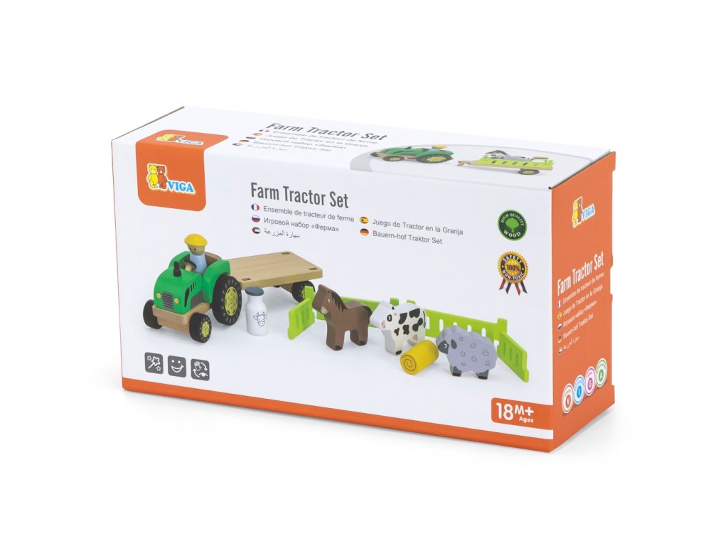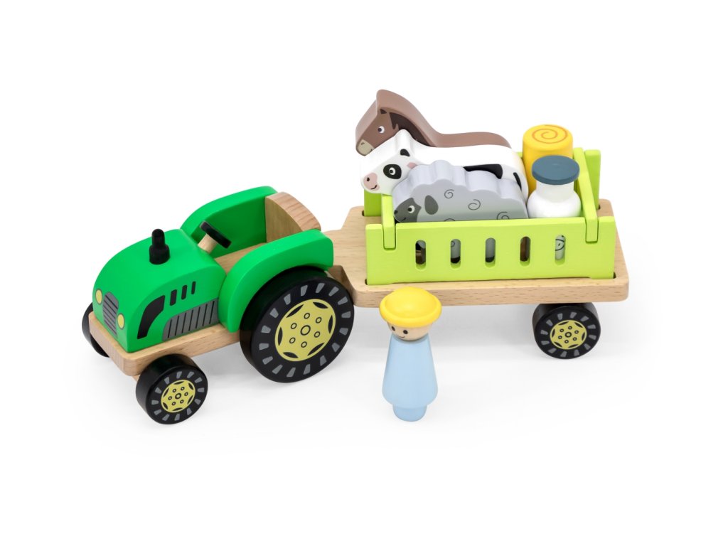 Hračka VIGA Drevený traktor s prívesom a zvieratkami je rozšírená o nové produkty, ktoré potešia nielen svojimi farbami, ale aj dokonale obohatia vaše existujúce hračky o farmách a hospodárskych zvieratách. Deti sa všetko učia pozorovaním sveta okolo seba as veľkou radosťou pomáhajú starať sa o zvieratká na farme, ako ich kŕmiť a starať sa o ne. Vtipný traktor od Vigy, ktorý príde na farmu s farmárom a zvieratkami, pobaví a poteší každé dieťa. Ploty, ktoré sú často nadstavbami traktorov, slúžia aj ako ploty za farmou, vďaka čomu je hra ešte realistickejšia. Sada sa skladá z farmárskeho traktora a odpojiteľného prívesu. Súčasťou sady sú aj drevené figúrky: farmár, kôň, ovečka, krava, fľaša na mlieko, balík slamy a 4 odnímateľné prvky z prívesu s bočným plotom. Horné časti traktorového prívesu je možné odpojiť a vytvoriť tak ohradu pre hospodárske zvieratá. Ďalšou výhodou je namontovaný čap, vďaka ktorému môžete traktor odpojiť a príves ľubovoľne otáčať. Batoľa môže umiestniť jednotlivé figúrky kamkoľvek a vytvoriť tak veľa možností na priebeh udalostí. Pri rozvíjaní fantázie a manuálnej zručnosti sa tiež naučíte určovať vzdialenosti. Tvar traktora je ľahko uchopiteľný aj pre malé deti. Skladá sa z mnohých farebných dielov, ktoré pomôžu vášmu malému rozvinúť motoriku a koordináciu ruka-oko. Obnovovanie situácií, ktoré dieťa pozná z každodenného pozorovania, má pozitívny vplyv na komplexný rozvoj dieťaťa, podporu sociálnych zručností, hru s rovesníkmi a riešenie problémov. Kontakt s drevenými hračkami prináša mnoho radosti a rozvíja zmysel pre estetiku dieťaťa.