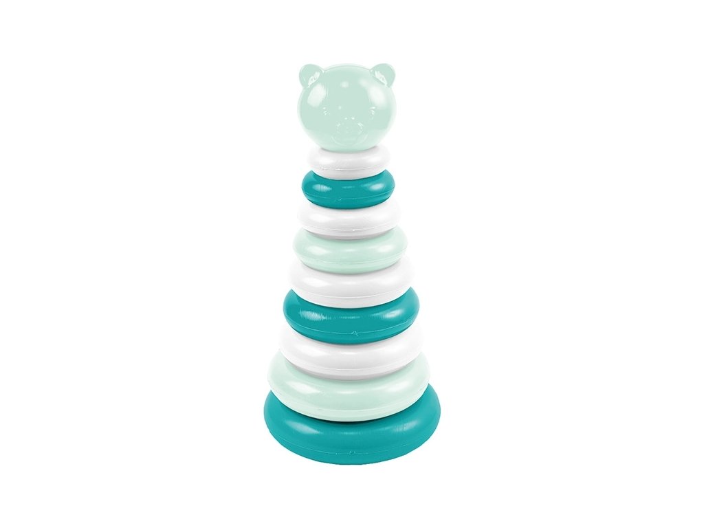 Originálne farby sýte tyrkysové, mliečne mätové a biele, perfektne ladiace do detskej izby. V rovnakej farbe slúži ako hračka aj dekorácia izby zároveň. Hračka skladajúca sa z 11 prvkov: základňa s tyčou, 8 farebných krúžkov a vršok v tvare hlavy medvedíka, výrobok venovaný deťom 1+.