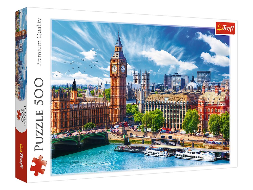 500dílné puzzle zobrazující pohled na slunný Londýn. Po sestavení vznikne obraz o rozměrech 580 x 340 mm.