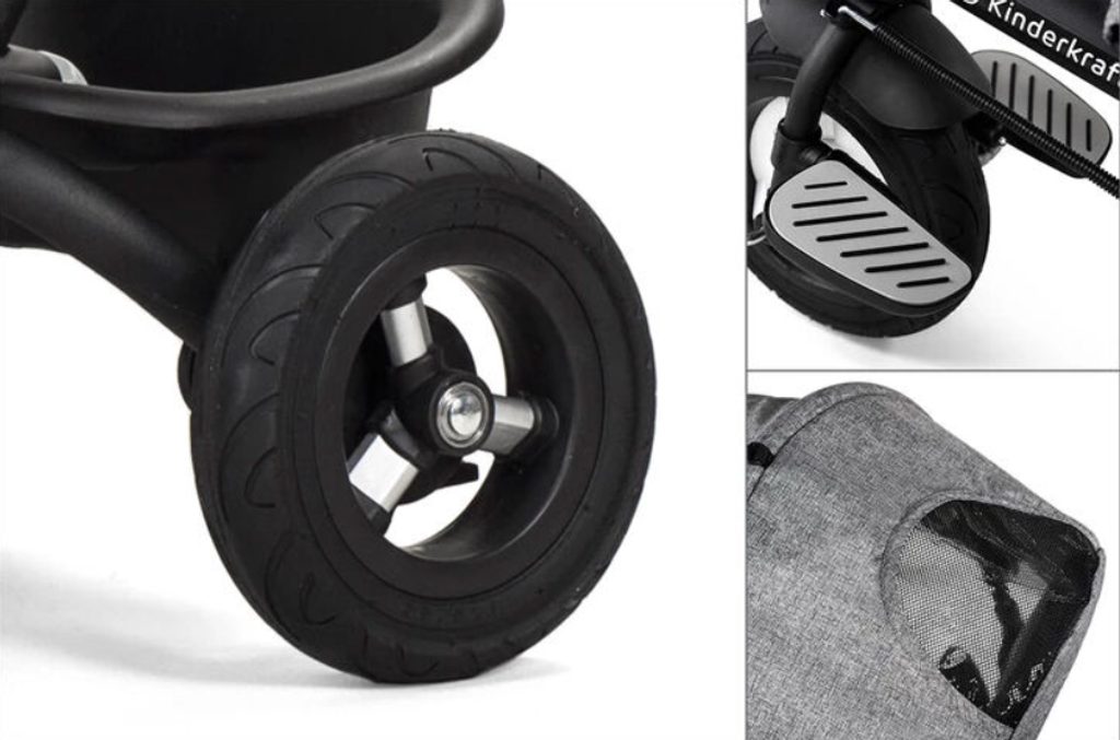 Materiály, ze kterých je tříkolka vyrobena - módní potah z polyesteru usnadňuje údržbu, gumová kola jsou bezúdržbová a celek doplňuje pevná ocelová konstrukce!