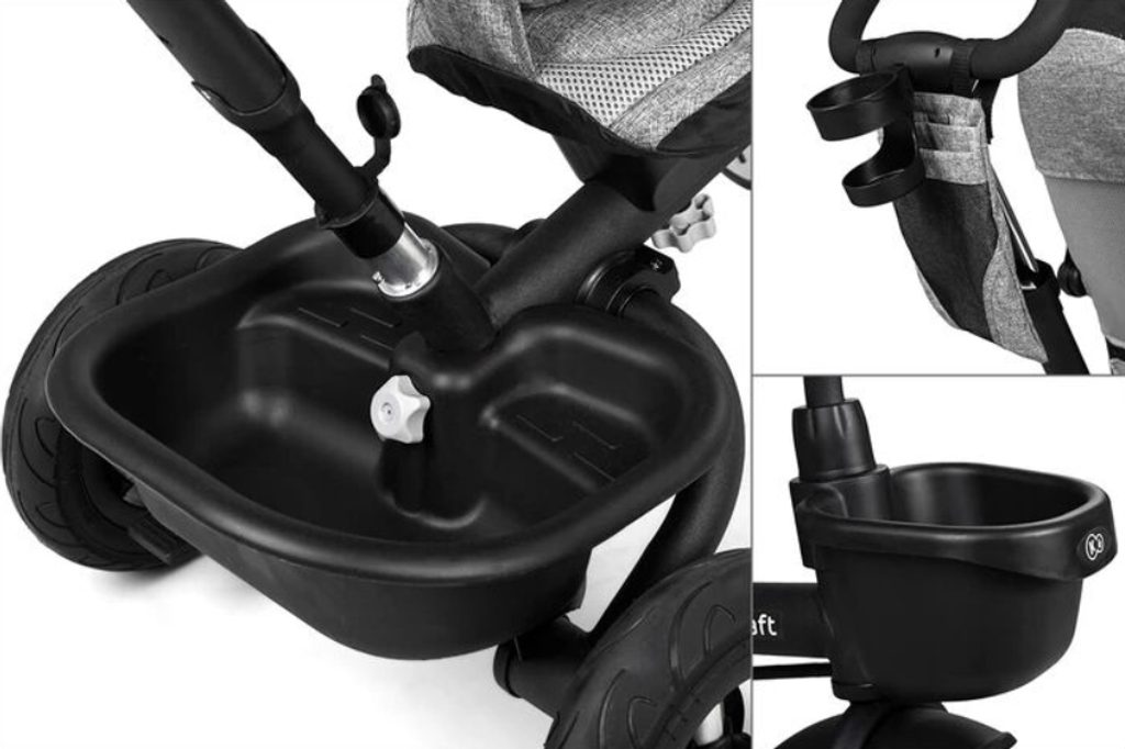 Užitečné košíky - menší, umístěný vpředu na kole, na váš oblíbený nápoj nebo milovaného medvídka, a větší vzadu na kole, jehož součástí je stupačka pro dítě.