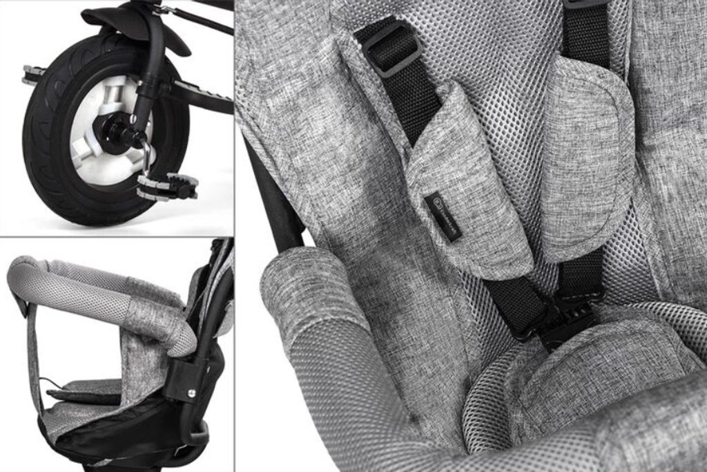 Materiály, ze kterých je tříkolka vyrobena - módní potah z polyesteru usnadňuje údržbu, gumová kola jsou bezúdržbová a celek doplňuje pevná ocelová konstrukce!